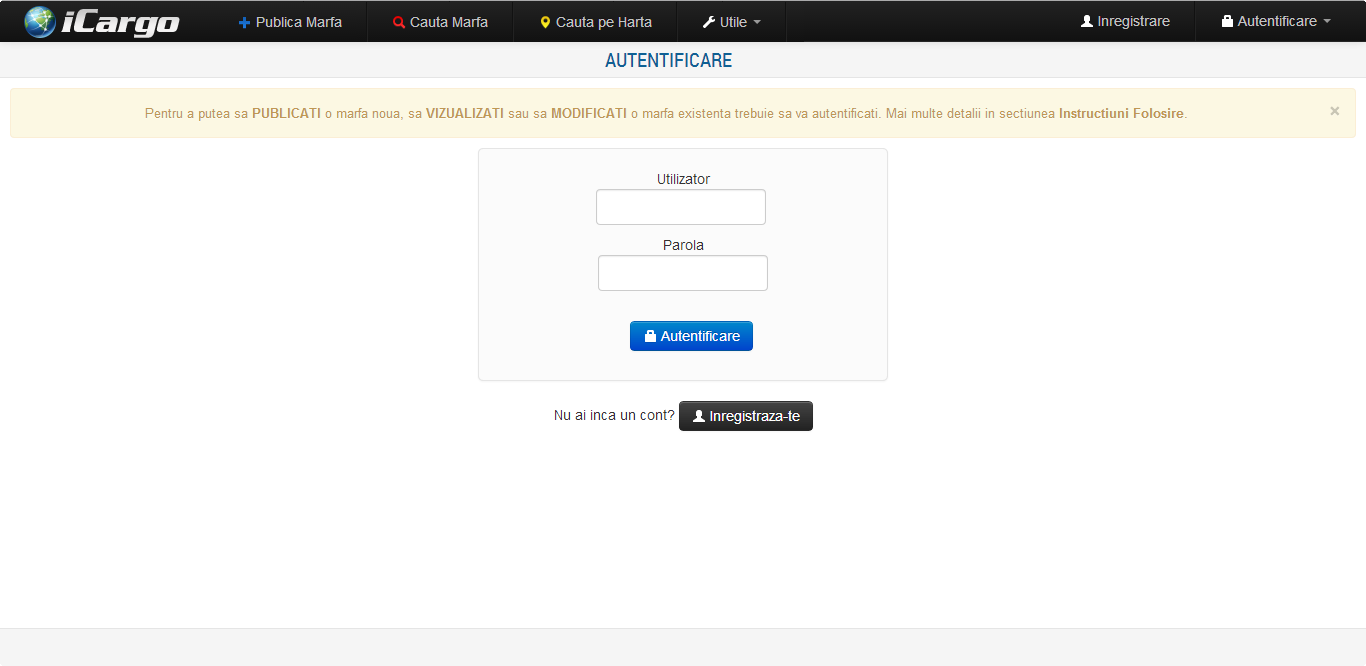 Pentru accesarea sectiunii de cautare, utilizatorul trebuie sa foloseasca bara de navigatie aflata in partea superioara a paginii, apasand pe butonul Cauta Marfa.