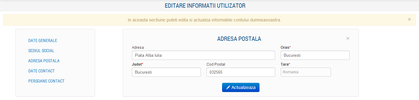 In aceasta sectiune sunt afisate urmatoarele informatii: Adresa, Oras, Judet, Cod Postal si Tara. Toate informatiilor pot fi modificate.
