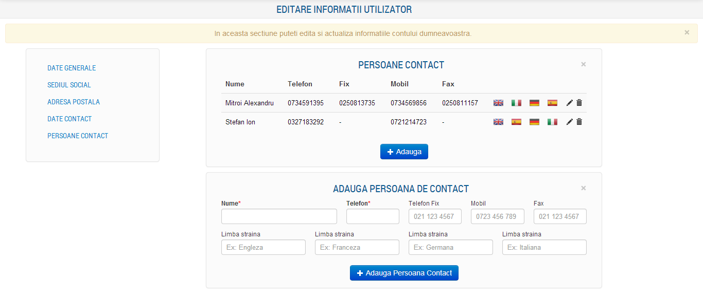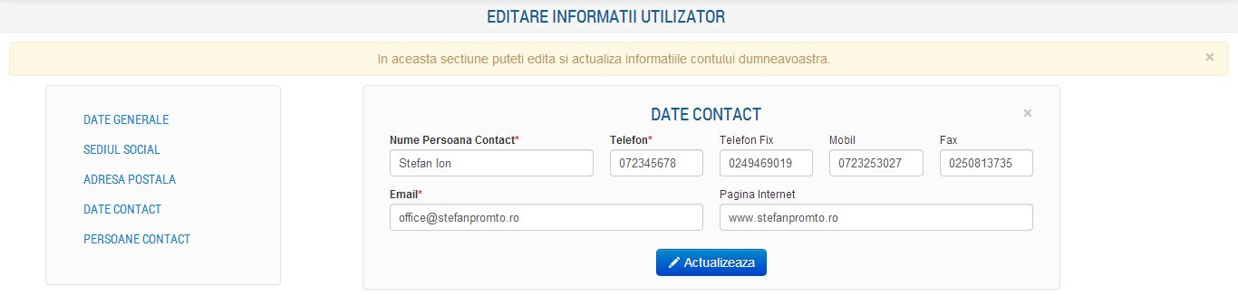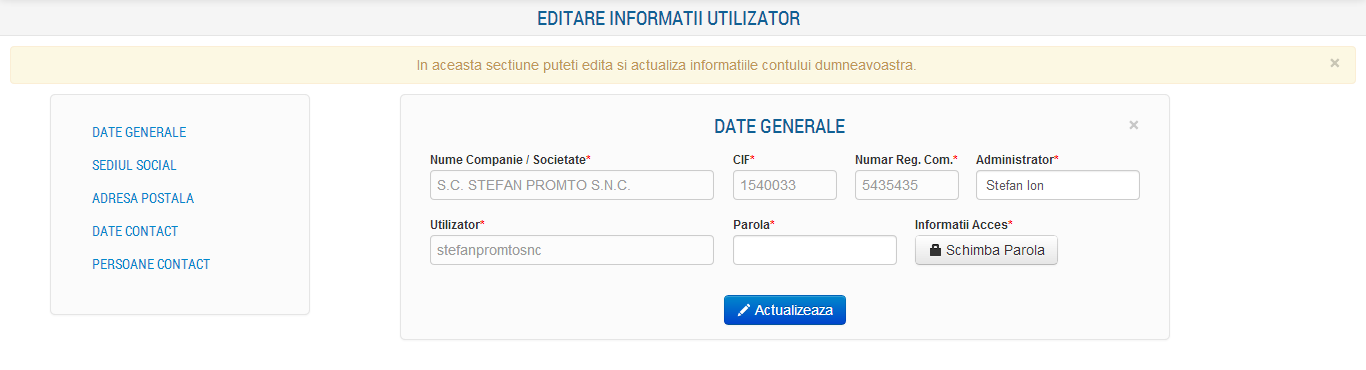 In aceasta sectiune sunt afisate urmatoarele informatii: Nume persoana de contact, Telefon, Fix, Mobil si Fax (numere de contact ale societatii). Deasemenea se poate modifica adresa de email si pagina de internet a societatii.