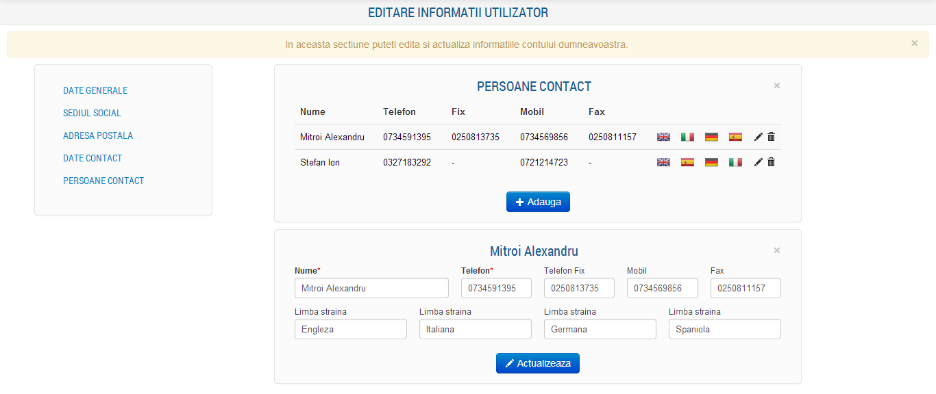 Informatiile ce sunt afisate in aceasta sectiune sunt: Nume, Telefon, FIx, Mobil, Fax si limbile straine cunoscute de fiecare persoana de contact in parte.