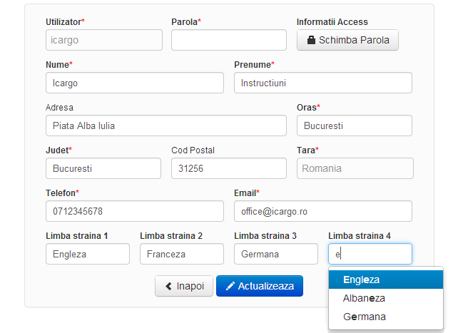 In sectiunea de administrare a contului se pot selecta limbile straine cunoscute te utilizator. In fiecare dintre cele 4 campuri destinate limbilor straine se completeaza prima litera iar apoi platforma indica variantele disponibile. Exemplu mai jos: