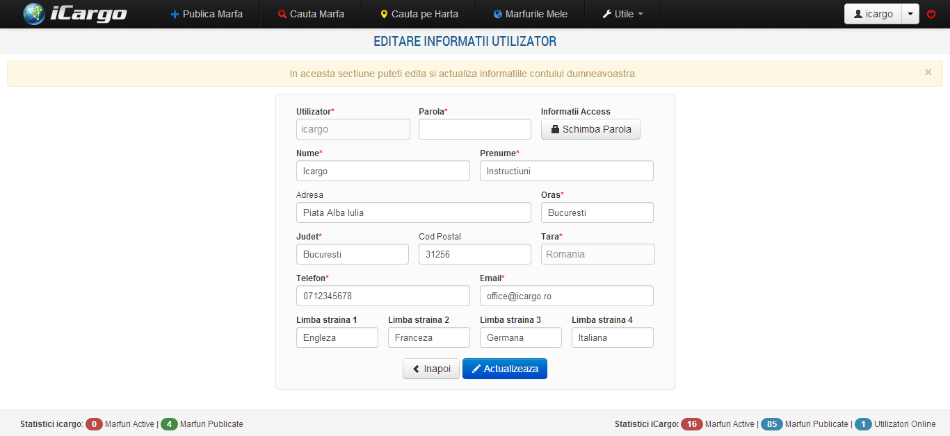 Persoanele fizice au posibilitatea sa schimbe toate informatiile ce tin de contul de utilizator exceptand numele utilizatorului si ID-ul iCargo.ro.