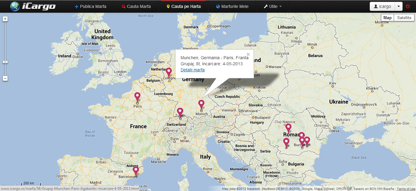 Pentru cautarea marfurilor, iCargo ofera doua variante de cautare, una standard de tip text ce ofera posibilitatea includerii in cautare a filtrelor precum greutate, metoda de plata, tipul marfii, etc. A doua metoda este grafica si se bazeaza pe modulul Google Maps. Aceasta metoda este prezentata in sectiunea Cauta pe Harta