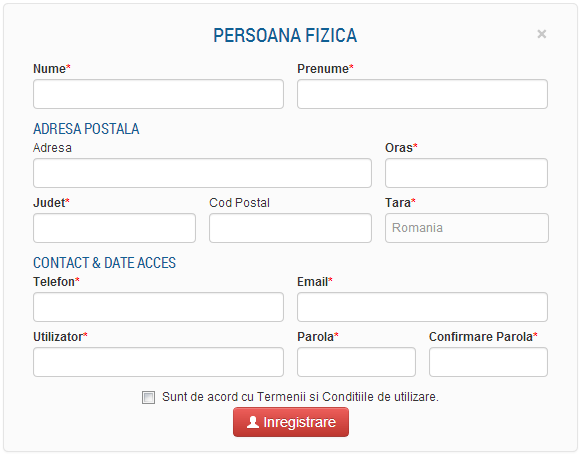 Pentru inregistrare, clientul trebuie sa completeze formularul aferent unei persoane fizice, campurile obligatorii fiind semnalate printr-o steluta de culoare rosie. Celelalte campuri sunt optionale si se pot completa ulterior accesand sectiunea Editeaza Cont.