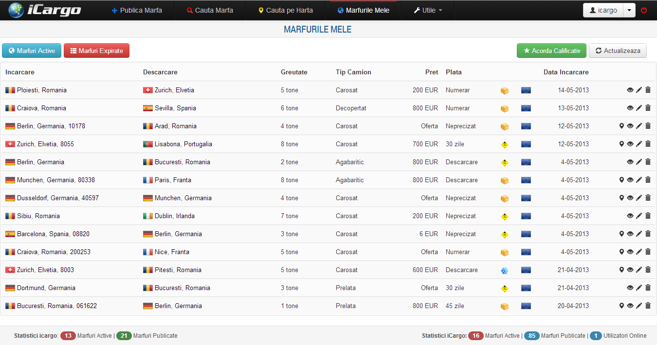 Bursa de marfuri iCargo.ro se adreseaza in principal firmelor si persoanelor fizice ce au nevoie de un transportator care sa ofere calitatea si promptitudinea asteptate de client, la cele mai bune preturi. Astfel si firmele de transport cat si casele de expeditii isi pot crea conturi distincte pentru desfasurarea activitatii pe aceasta platforma.