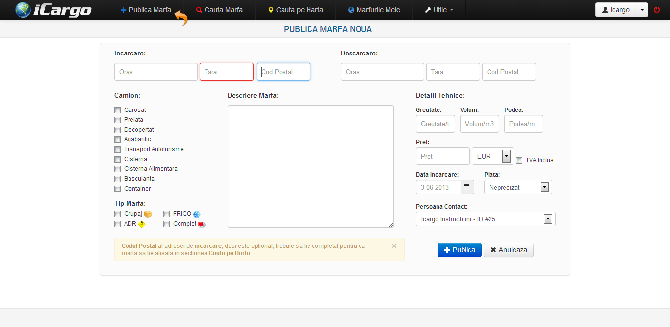 Pentru a putea publica o marfa, utilizatorul trebuie sa fie autentificat. Accesarea sectiunii de publicare se face din bara de navigatie in coltul stanga sus. Va fi incarcata o pagina destinata exclusiv publicarii de marfuri. Aceasta include urmatoarele elemente: Adresa Incarcare, Adresa Descarcare, Camion, Tip Marfa, Descriere, Greutate, Volum, Podea, Pret, Valuta, Data Incarcare, Metoda de Plata si Persoana de Contact.