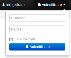 Autentificarea in contul dumneavoastra se poate face in moduri multiple. Cea mai rapida varianta este din bara de navigatie, selectand in partea dreapta sus butonul Autentificare ce va deschide formularul de autentificare. Acesta include doua campuri: Utilizator si Parola. Aceasta metoda este prezentata in exemplul de mai jos.