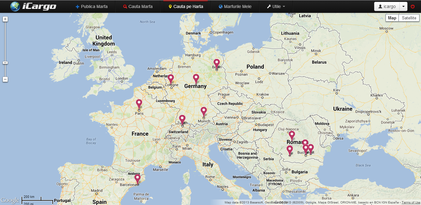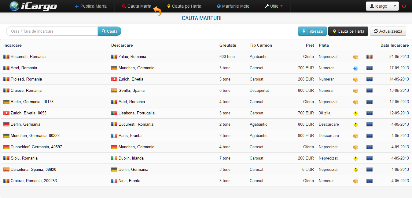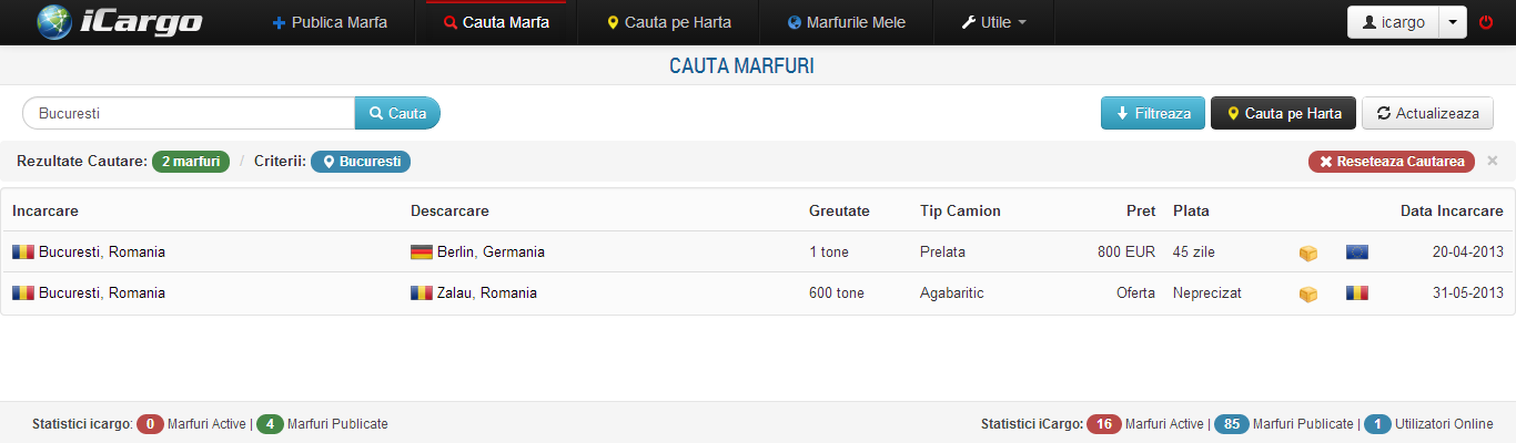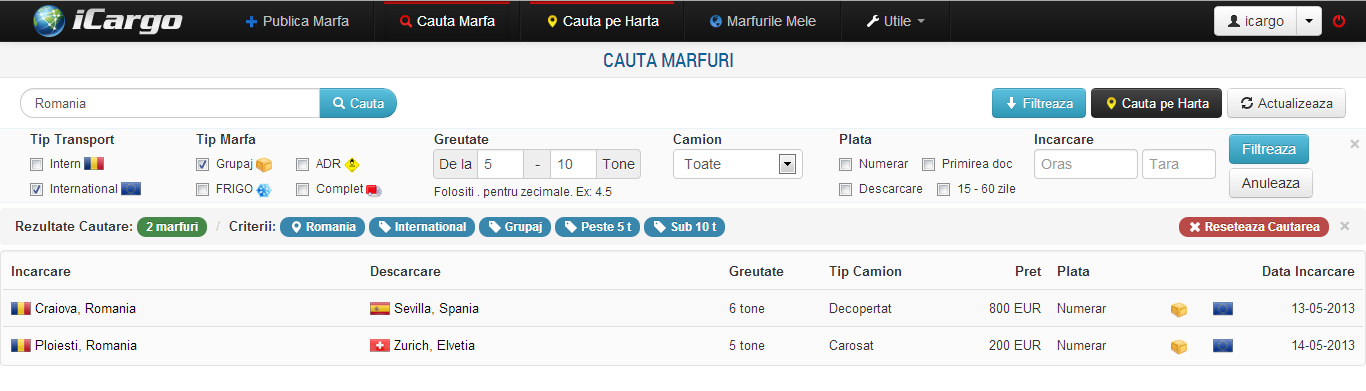 Pentru cautarea marfurilor, iCargo ofera doua variante de cautare, una standard de tip text ce ofera posibilitatea includerii in cautare a filtrelor precum greutate, metoda de plata, tipul marfii, etc. A doua metoda este grafica si se bazeaza pe modulul Google Maps. Aceasta metoda este prezentata in sectiunea Cauta pe Harta