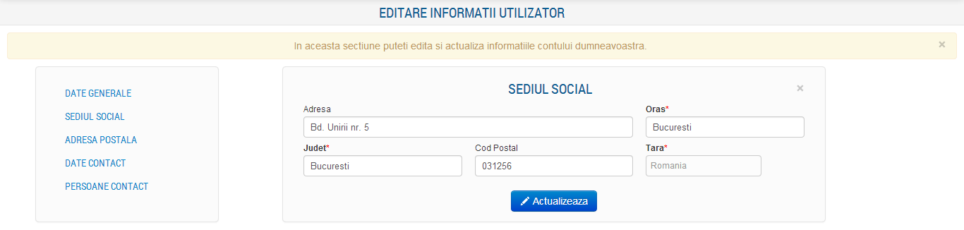 In aceasta sectiune sunt afisate urmatoarele informatii: Adresa, Oras, Judet, Cod Postal si Tara. Toate informatiilor pot fi modificate.
