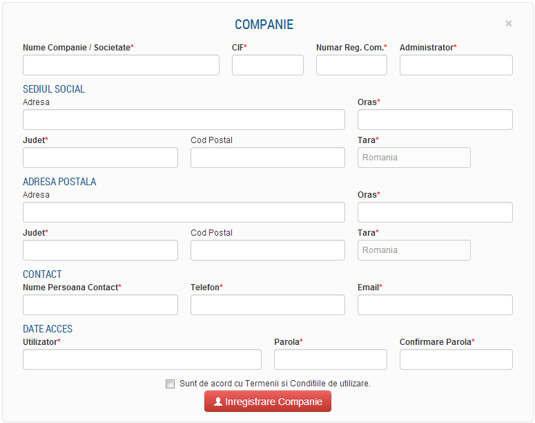 Pentru inregistrare, clientul trebuie sa completeze formularul aferent unei companii, campurile obligatorii fiind semnalate printr-o steluta de culoare rosie. Celelalte campuri sunt optionale si se pot completa ulterior accesand sectiunea Editeaza Cont.