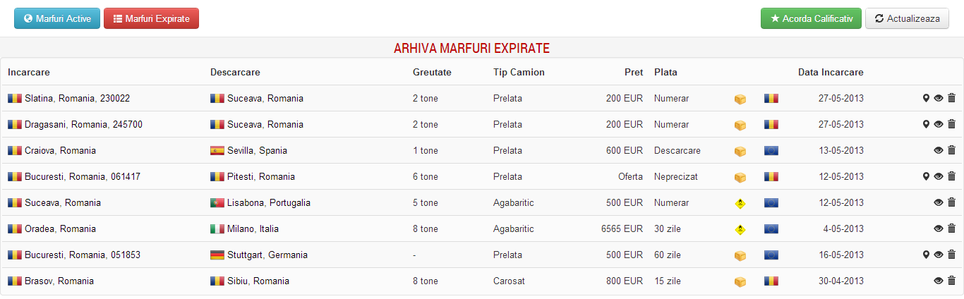 Marfurile Expirate pot fi vizualizate apasand pe butonul cu acelasi nume din partea stanga sus a ecranului. Exista cateva diferente fata de sectiunea marfurilor active prin disparitia butonului de editare ce nu mai este relevant in cazul in care marfa a expirat. A doua diferenta este data de faptul ca stergerea din Arhiva de Marfuri Expirate va duce la stergerea completa si irevocabila a datelor despre marfa respectiva. iCargo va sterge complet din serverul platformei informatiile despre marfa stearsa din arhiva.