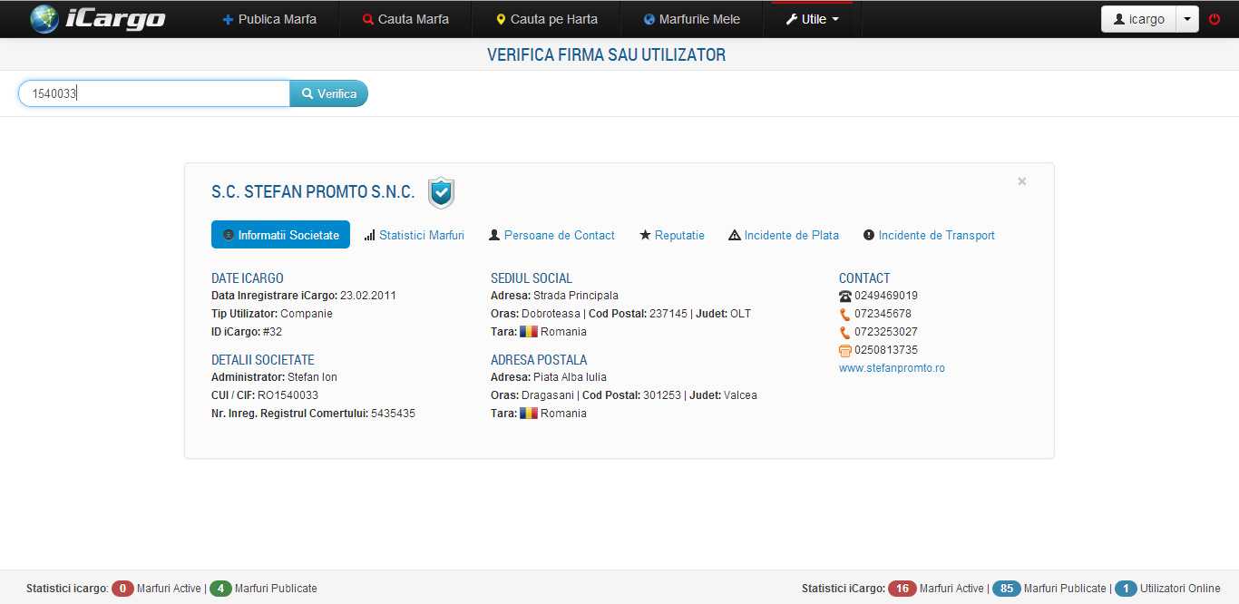 Companiile, Casele de Expeditii si Brokerii trebuie sa fie inregistrati pe platforma iCargo cu toate datele de identificare a firmei. In momentul verificarii unui utilizator de tip comercial toate datele de identificare vor fi valabile. Exemplu in imaginea de mai jos.