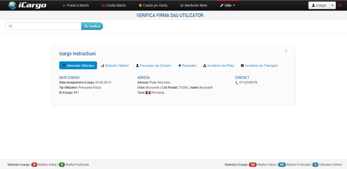 iCargo.ro ofera utilizatorilor posibilitatea de a verifica orice membru al comunitatii indiferent ca este persoana fizica, companie, transportator, casa de expeditii sau broker.